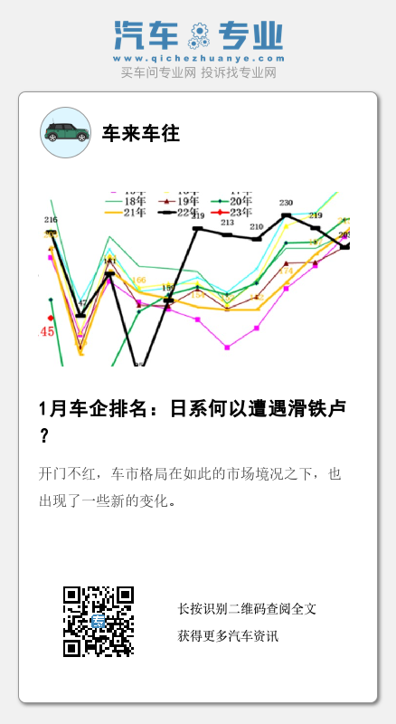 另外东风日产1月份月销量仅3.5万辆,从原本前十强的地位掉落至16名的位置,合资主流地位受到严峻挑战。究其原因,一方面是主流细分市场主流车型受到挤压,同时节能车和新能源车补位困难,是造成东风日产出现问题的重要原因。