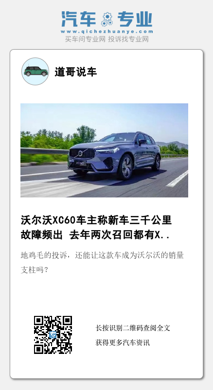 自发布《“看点投诉”与多家媒体征集315汽车质量线索》(https://caiquanshe.com/kandiantousu)后,近期有一位来自吉林的沃尔沃XC60车主向《财圈社》以及旗下道哥说车编辑反映称自己的车存在诸多毛病。