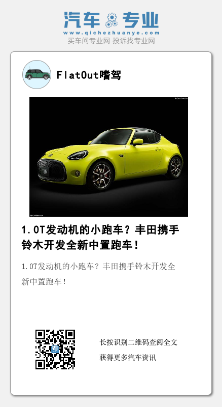 近日,对于专注小型跑车爱好者的福音似乎终于降临,根据国外媒体的消息指出,丰田正在联合铃木共同开发一款小跑车,这款小型跑车将会使用轻混内燃机的动力设定,并且是一款中置发动机的车型,采用1.0L涡轮增压发动机,最大输出117 Hp,峰值扭矩200 N·m,感觉相当不错。