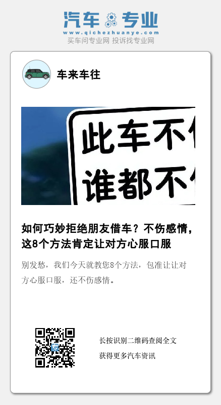 借车这件事,让人心烦,绝大多数车主是不想将自己的爱车借给朋友的。既然不想借车,我们就要学会办法拒绝朋友,上述8个方法就挺不错,既给了对方面子,也婉拒了对方的请求。