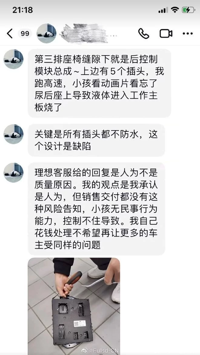 根据车主的描述,自家孩子在第三排座椅上撒尿,但没有想到座椅下面是控制模块,所以遇到水之后,控制模块就被烧了。