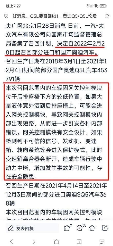 有意思的是,在2022年2月,奥迪召回了部分国产和进口车。召回的原因跟这次理想L9的原因非常相似,是因为车辆网关控制模块位于座椅下方较低的位置,如果大量液体洒到座椅上,可能会进入网关控制模块,导致出现短路,存在安全隐患。所以奥迪就将车型召回了。