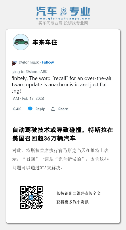 对此,特斯拉首席执行官马斯克当天在推特上表示,“召回”一词是“完全错误的”,因为这些问题可以通过OTA来解决。