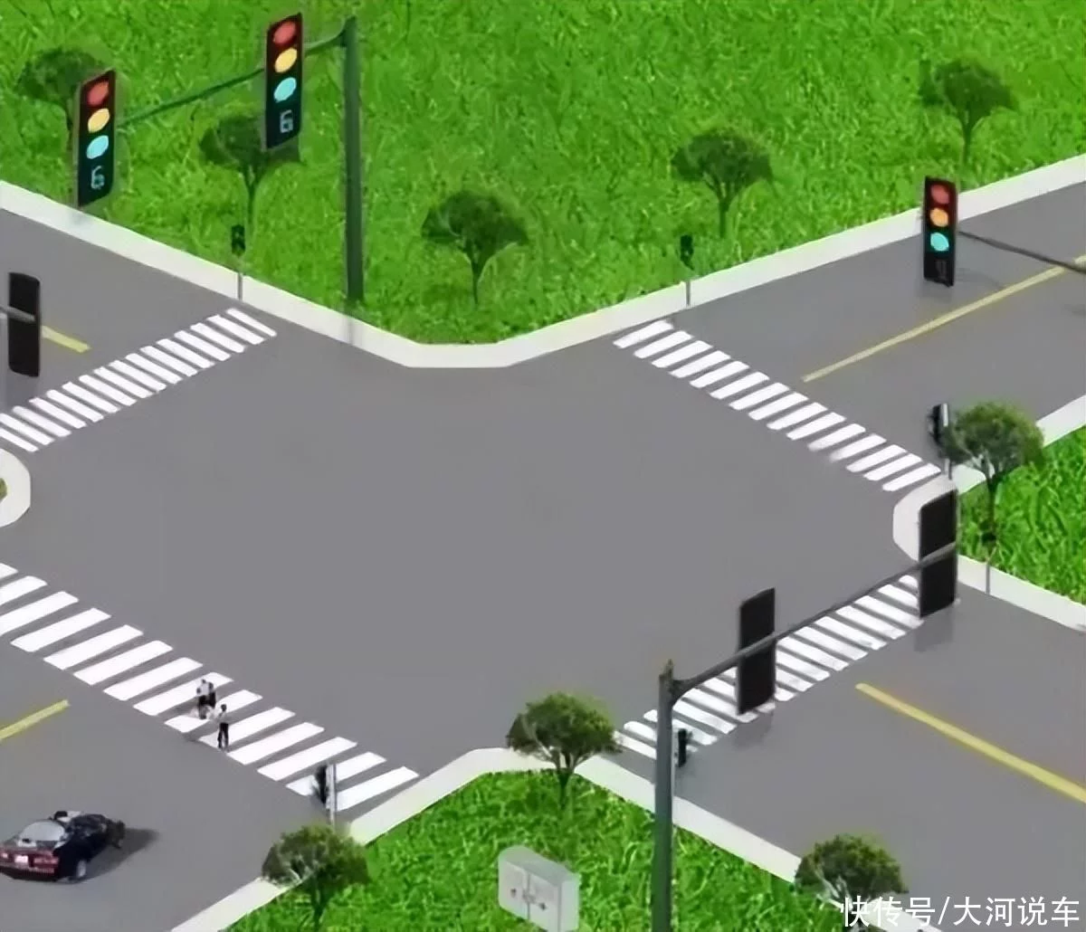 大多数路口每个方向都设有信号灯,正前方看不到时,可看其他灯组,比如看路口侧面位置垂直方向的信号灯、人行横道灯,来辅助判断当前行驶方向的信号灯状况。