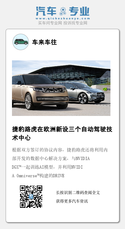 去年,捷豹路虎和英伟达宣布了一项多年协议。根据协议,双方将联合开发并提供新一代自动驾驶系统和 AI 支持服务。从 2025 年开始,从基于英伟达数据中心解决方案的云端,到由 NVIDIA DRIVE Orin™提供动力支持的汽车,所有的新型捷豹路虎汽车均将基于 NVIDIA DRIVE™ 软件定义的平台构建。捷豹路虎汽车将通过无线更新不断改进,借助基于 AI 的安全系统、自动驾驶功能和数字服务,满足客户需求。
