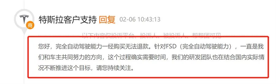 《财圈社》第一时间致电特斯拉,工作人员的回应与投诉平台上如出一辙,表示FSD的未来功能是指车主无需额外购买新功能,目前还不能确定具体的更新时间,也确实无法办理退款。
