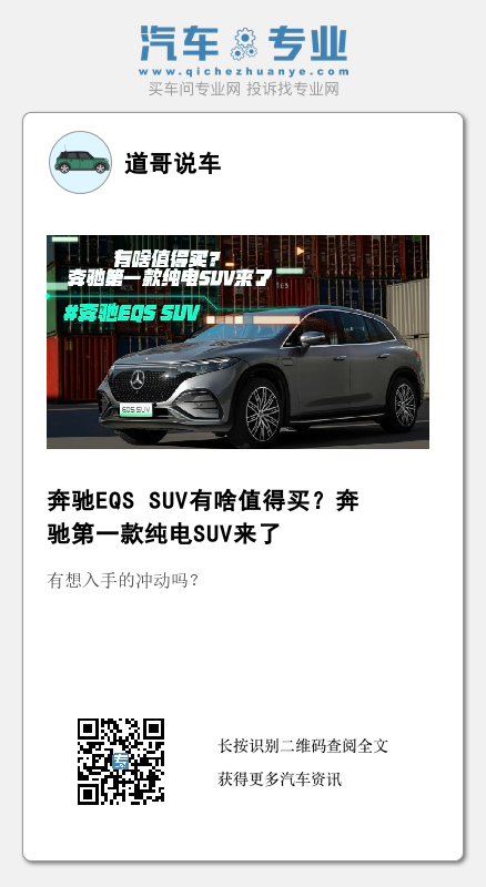 基于奔驰EVA纯电平台研发的第一款SUV车型终于来了,今天我们来聊聊奔驰EQS。定位大型豪华纯电SUV,共推出3款首发车型,售价为91.05-110.05万元。内饰三块大屏幕为曲面屏设计,更重要的是,EQS SUV将具备8核心CPU和24GB内存,可谓是硬件拉满,完全符合豪华SUV的定位。续航方面,新车将会搭载容量为107.8kWh的动力电池,官方WLTP工况下行驶里程可达671km。虽然续航里程与EQS有些差距,但是作为SUV,671km的续航表现也是完全够用的。有想入手的冲动吗?