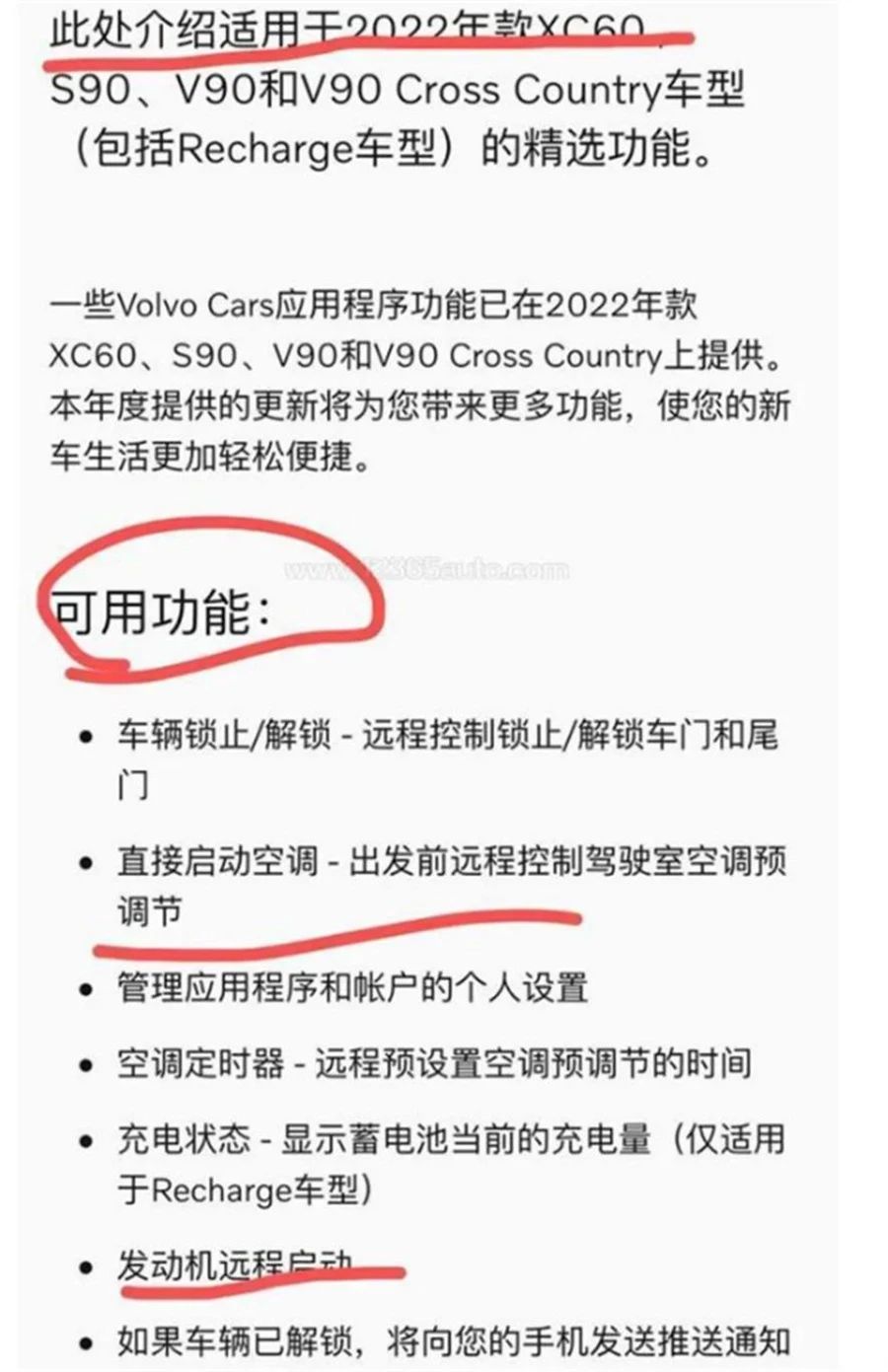 一位2022款沃尔沃S90的车主表示,最初在沃尔沃的官方网站、宣传手册和车主手册都把安卓车机功能和手机app远程控制作为宣传卖点,承诺后期车机OTA能够实现车主手册中描述的“VolvoCars”app应用程序远程控制车辆功能。功能包括锁止/解锁车门,远程启动车辆,远程空调控制,空气净化等。
