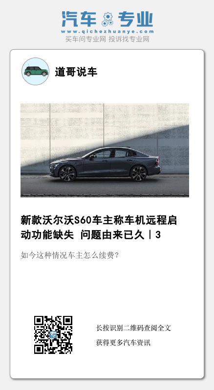 “厂家方面只让等信儿,就是没有人出来说明问题该如何解决。”李先生透露,由于自己在东北这边没有车库,早上车特别凉,正是因为当初看中了沃尔沃S60的车机远程启动功能才选择购买了这款车,奈何最终事与愿违。