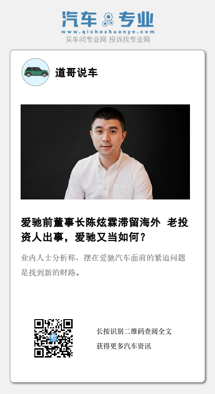 【文/道哥说车 听风吟】据消息人士向《道哥说车》编辑透露,爱驰汽车前董事长陈炫霖因所在投资机构暴雷,出现逾期无法兑付情况,其本人也已经滞留海外。与此同时,上述消息人士称,陈炫霖所持爱驰汽车股份也被冻结,这也是陈炫霖任职爱驰汽车董事长不到5个月就离职的原因之一。