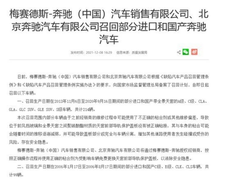 而到了2021年12月,奔驰再度因天窗脱落风险发起召回,彼时召回的是2013年11月16日至2020年9月16日期间生产的部分进口和国产带全景天窗的A级、C级、CLA、GLA、GLC SUV、GLE SUV、S级车辆,共计214辆;召回生产日期在2006年1月17日至2006年8月17日期间的部分进口和国产C级、E级、CLK、CLS车辆,共计99辆。