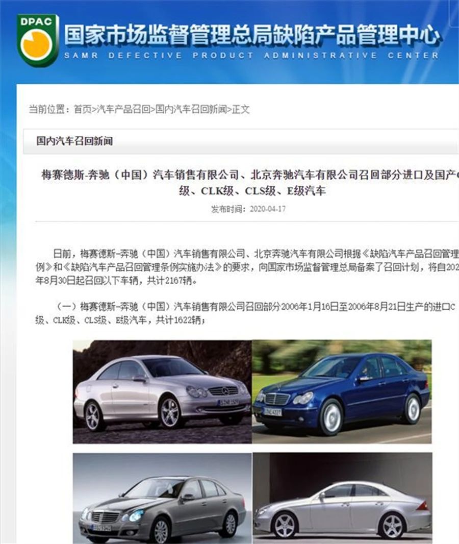 为何说是扩大召回,因为早在2020年4月17日,奔驰就因同样的问题发起过召回。彼时,奔驰召回部分2006年1月16日至2006年8月21日生产的进口C级、CLK级、CLS级、E级汽车,共计1622辆;召回部分2006年1月16日至2006年2月22日生产的国产E级汽车,共计545辆。