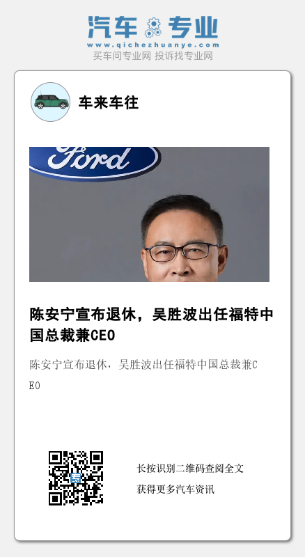 2月24日,福特中国宣布,福特中国总裁兼首席执行官陈安宁将于今年10月1日正式退休。在卸任福特中国的职务后,陈安宁将参与有关提升公司全球战略竞争力和业务增长的项目,并继续向吉姆∙法利汇报。