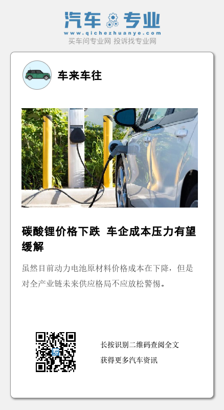 他认为,随着新能源车连续2年多的暴增,碳酸锂等资源价格暴涨带来暴利,随之而来的上游资源和中游电池产业的投资力度很强,必然带来供给的产能高增长,前期的供需错配带来的碳酸锂高价格将明显回落,有利于新能源车的盈利压力的改善。