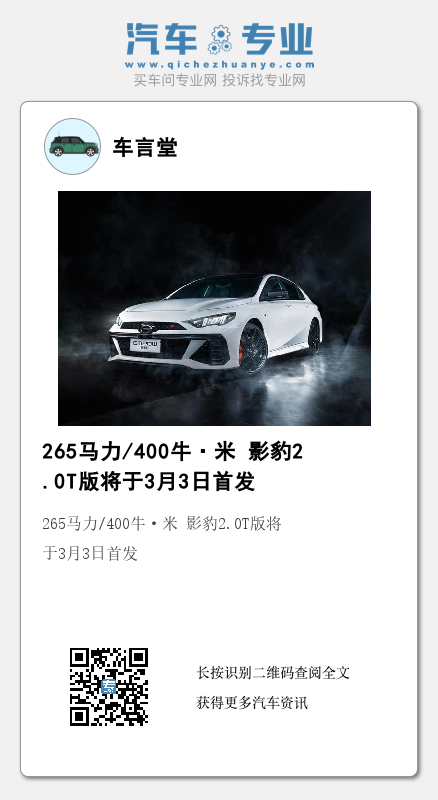 近日,我们从传祺官方获悉影豹(图片|配置|询价)2.0T车型将于3月3日首发,新车有望在4月内上市,预计价格在20万元以内。