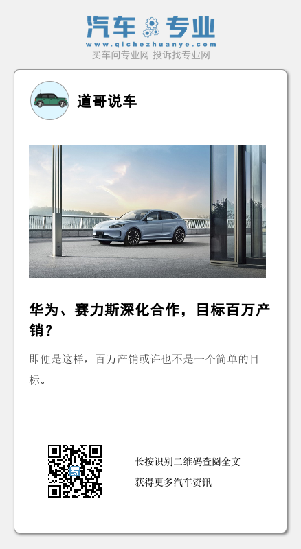新平台下首款旗舰车型计划于今年发布,将搭载高阶智能驾驶系统,并在后续陆续推出多款全新车型。并且,到2026年,赛力斯公司的联合业务目标是实现新能源汽车产销达到100万辆。据相关报道,上述消息来自于“赛力斯集团”公众号,不过,《道哥说车》编辑并未在赛力斯集团公众号以及华为、赛力斯官网等渠道找到相应推文,且赛力斯也尚未发布相应内容公告。