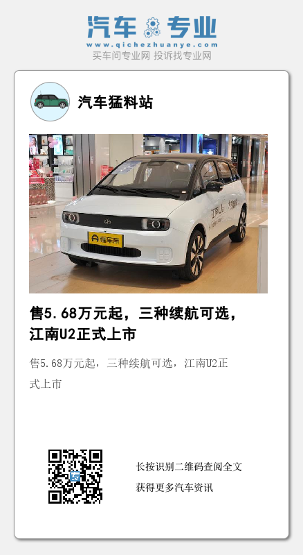 2月26日,江南U2(图片|配置|询价)正式上市,新车共推出6款车型,指导价5.68-9.88万元。新车提供了三种续航可选,最高续航达406公里,具体如何,我们不妨一起关注一下。