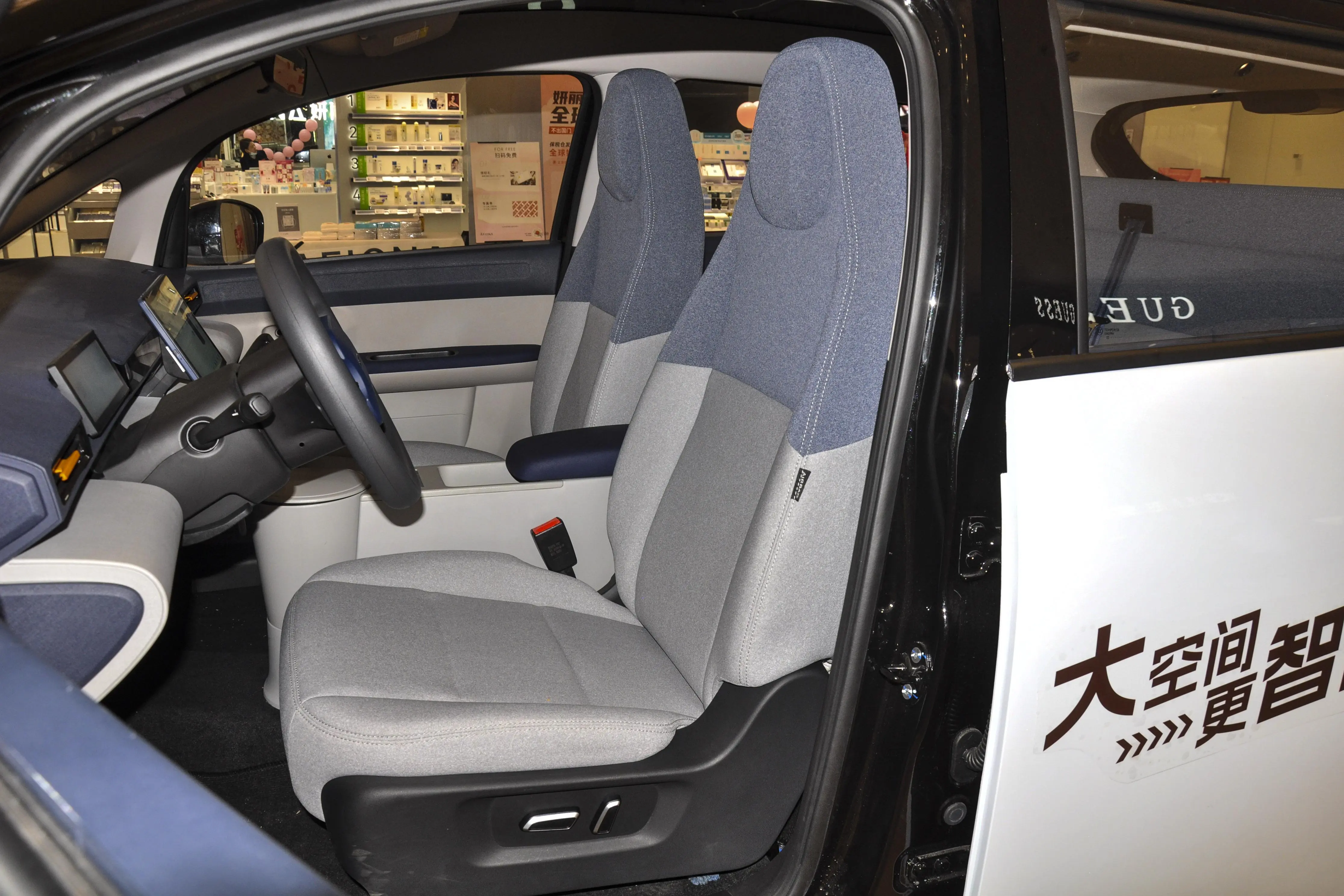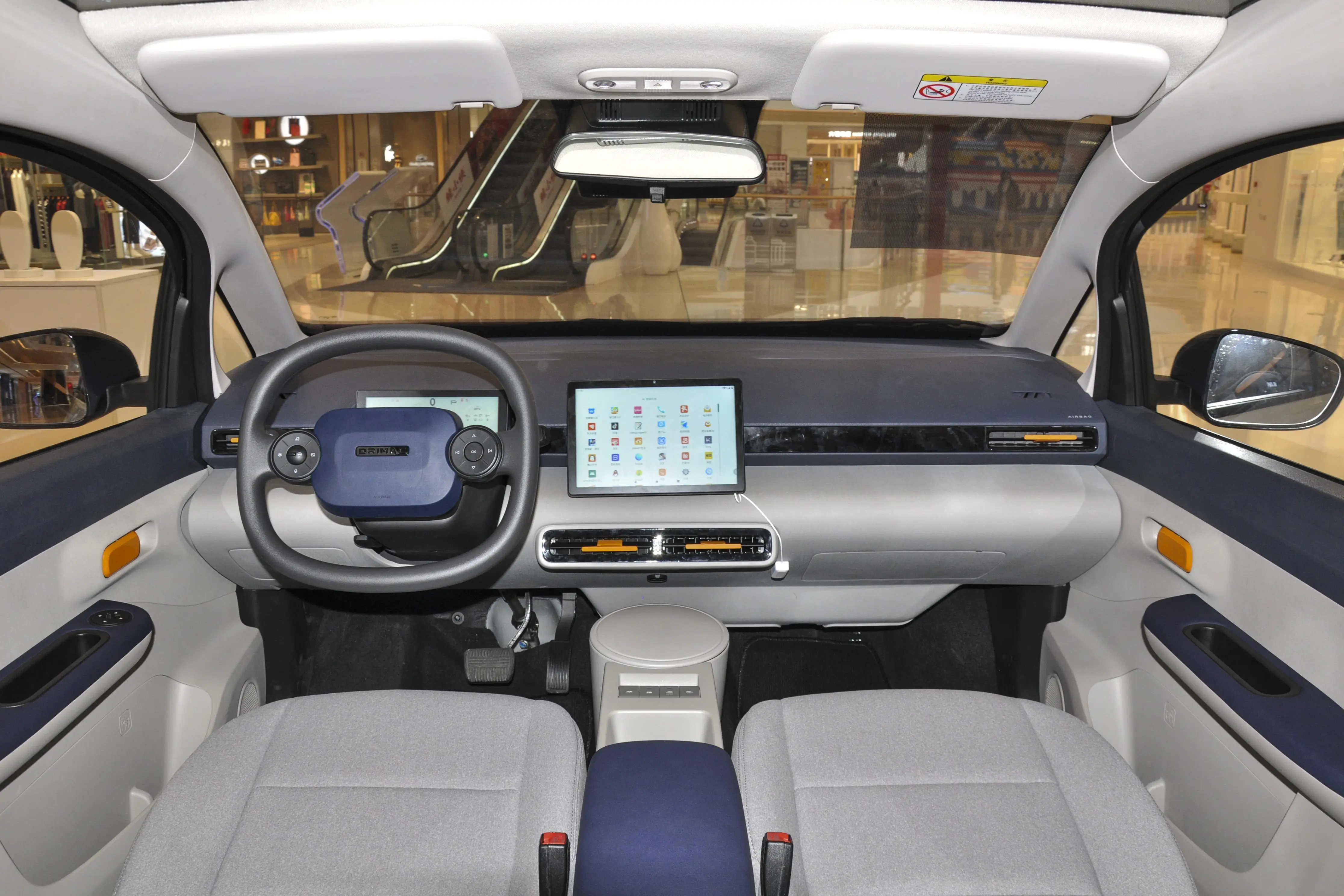 内饰方面,车内加入的亮色元素对活力的提升很有帮助,近乎方形的两幅式方向盘也显得比较个性,并且车内还配备有两块大屏,带来了不错的科技感。座椅方面采用的是2+3的五座布局,座椅采用一体化设计并呈现拼色效果,重点强调时尚感。