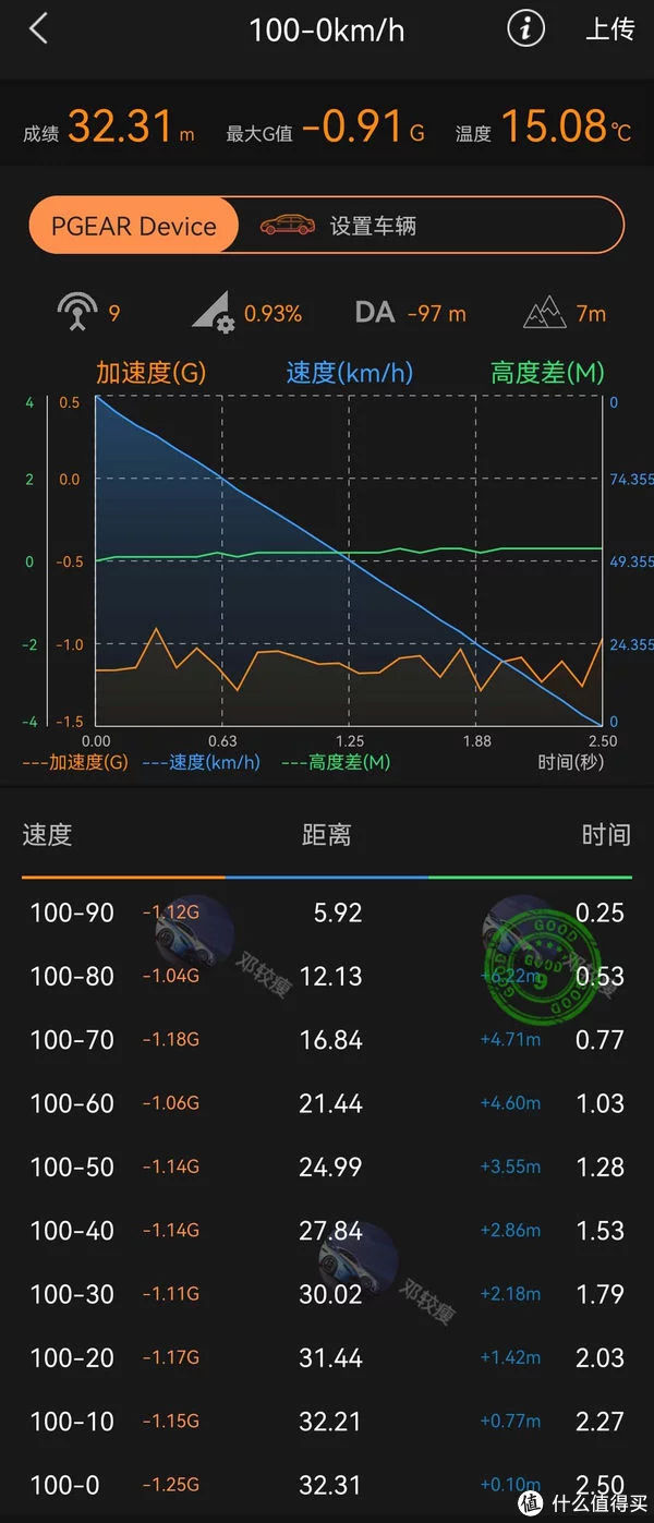 实际数据再次刷新了我的认知,最好的一次100-0干地全力制动距离直接干到32.31米!后面几次也稳定在33米开外。要知道,我开的只是一台1.2T的雷凌,这是一台典型的买菜车。