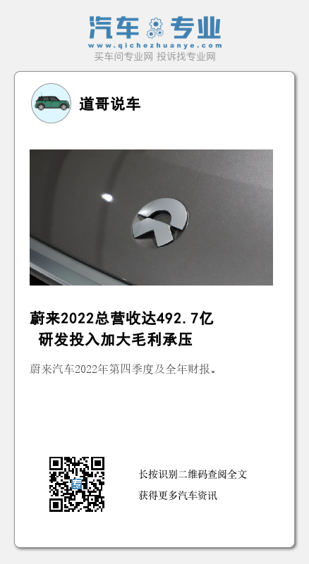 【文/道哥说车 浅浅】3月1日,蔚来汽车发布2022年第四季度及全年财报。2022年第四季度,蔚来汽车实现营收160.64亿元,同比增加62.2%,连续11个季度正增长;季度交付量达到40,052辆,同比增长60.0%,环比增加26.7%。2022全年总营收492.7亿元,同比增加36.3%,创历史新高;全年交付量达到122,486辆,同比增长34.0%。