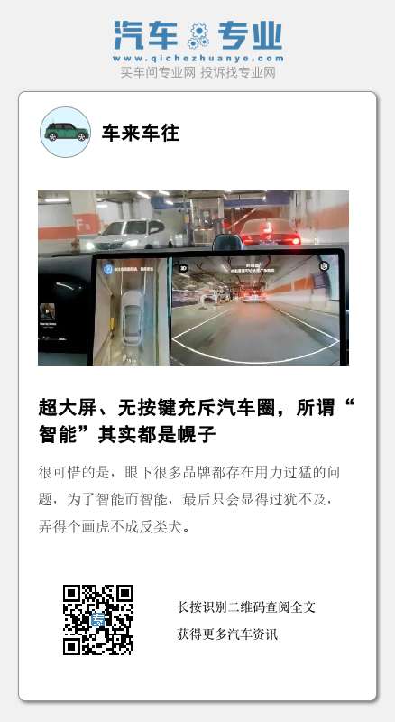 只能说,现在很多行业的做法已经让人看不懂了。也不止是汽车行业,家电行业也是如此。不管是冰箱、洗衣机、空调、电饭煲,加上个大屏就是“智能”,不仅能刷抖音、听音乐,居然还能看广告。说到头里,“智能”应该是锦上添花,而不是画蛇添足。很可惜的是,眼下很多品牌都存在用力过猛的问题,为了智能而智能,最后只会显得过犹不及,弄得个画虎不成反类犬。