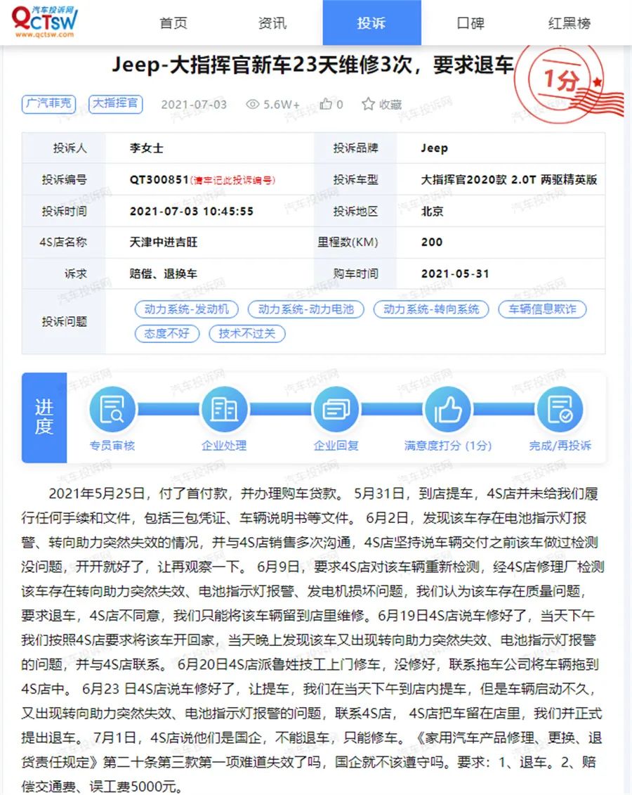 须知,这是两年不到的新车,居然出现了如此多的质量问题,而这样的案例还并不少见。甚至还有车主经历过,Jeep大指挥官新车23天维修3次的离奇经历,汽车投诉网中,Jeep大指挥官车主李女士曾在2021年投诉中反映,其新车经历了多次电池指示灯报警、转向助力突然失效的情况,在23天里,维修了3次。