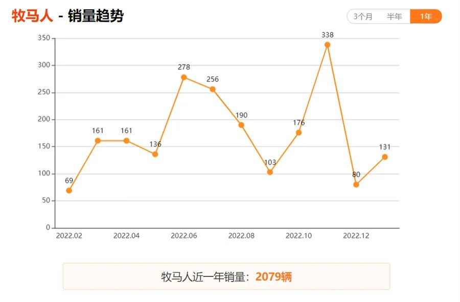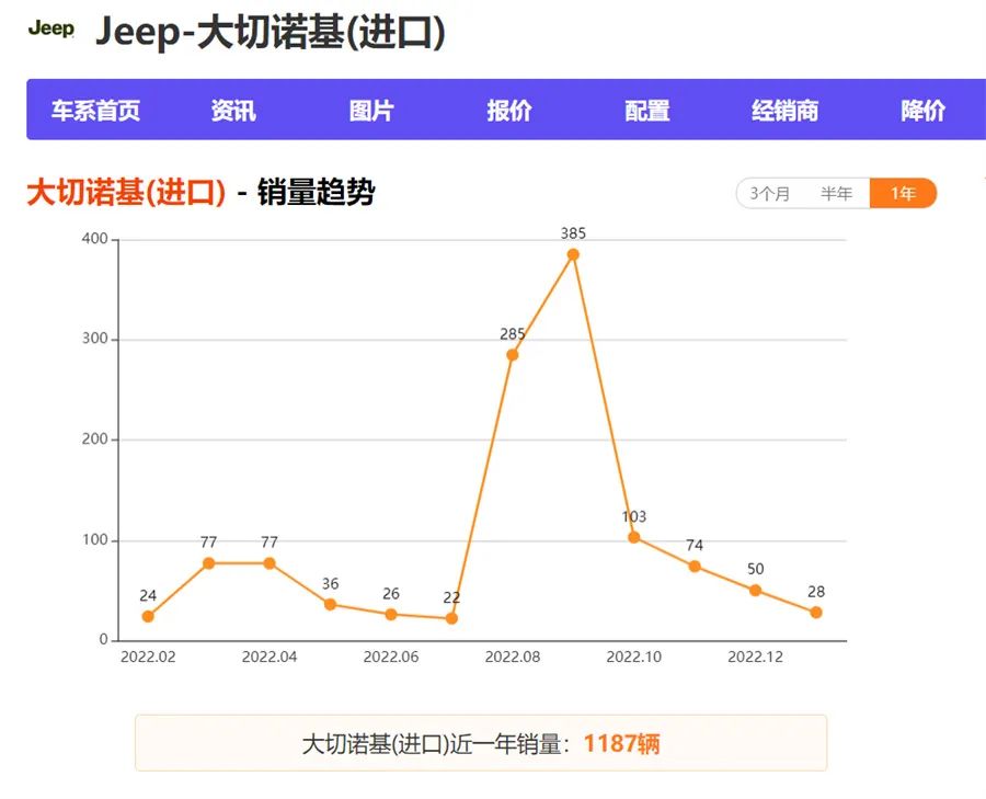 众车网数据显示,牧马人车型近一年(2022年2月—2023年1月)销量仅为2019辆,其销量巅峰在2022年11月,当月销量338辆,紧接着12月销量跌至80辆,今年1月销量也仅回升至131辆;大切诺基车型近一年销量则仅为1187辆,销量巅峰在2022年9月,当月销量385辆,紧接着则是一路下滑,直至今年1月已经跌至28辆。