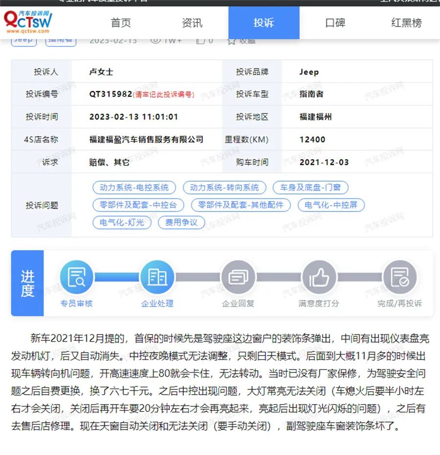 不过,似乎彼时的那记警钟并没有敲醒Jeep,随后几年里Jeep的品质还是一言难尽。“新车2021年12月提的,首保的时候先是驾驶座这边窗户的装饰条弹出,中间有出现仪表盘亮发动机灯,后又自动消失。中控夜晚模式无法调整,只剩白天模式。后面到大概11月多的时候出现车辆转向机问题,开高速速度上80就会卡住,无法转动”,Jeep指南者卢女士在汽车投诉网中表示。