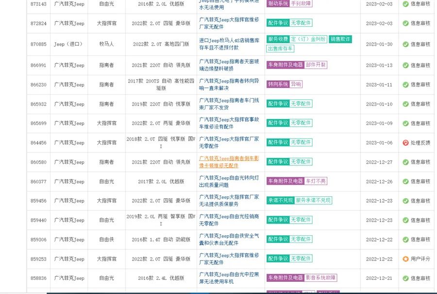 而如果再仔细翻看,汽车投诉网以及其他汽车投诉网站的相关信息,Jeep旗下车型几乎都出现了数量较大且种类繁多的投诉。值得关注的是,随着广汽菲克的破产,新的问题再度出现,《道哥说车》编辑注意到,在第三方汽车投诉网站车质网中,出现了大量车辆故障而无配件更换以及无法提供质保服务的问题。