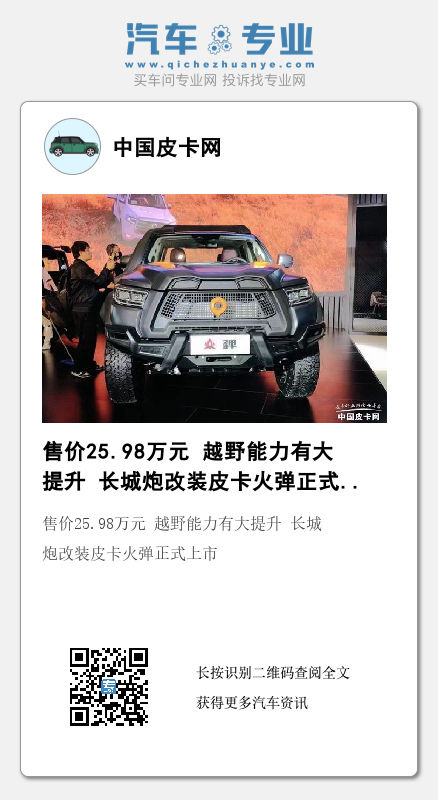 总结:火弹的上市,为长城炮的改装皮卡家族又增添了一员猛将,对于拓展皮卡玩乐属性、打开越野市场有极大的影响,也为众多皮卡爱好者提供了改装的思路。