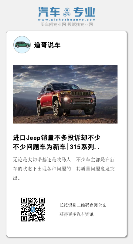 【文/道哥说车 浅浅】虽然国产Jeep已经成为了历史,但是以大切诺基、牧马人为代表的进口车型仍带着车主们的信仰维系着品牌在中国市场最后的光环。奈何进口Jeep在保有量较少的情况下也难掩诸多质量问题投诉,着实成为了一个存在感日渐走低的汽车品牌。