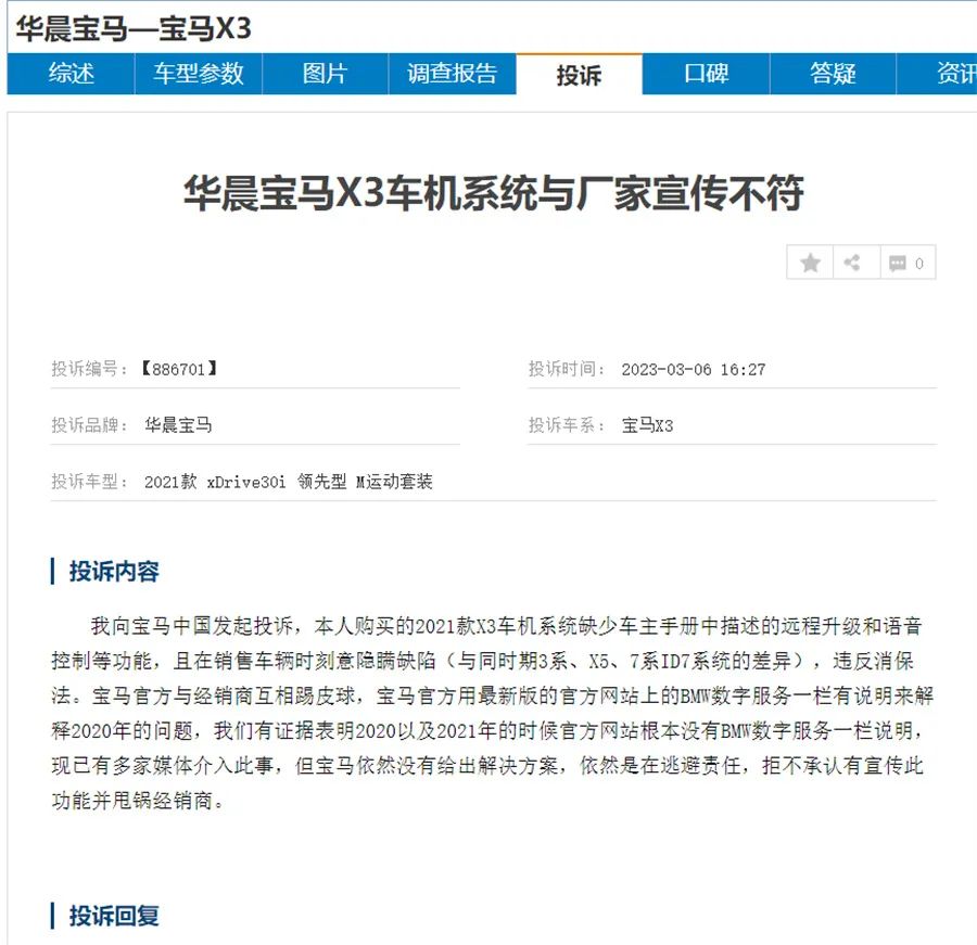 从以上车型的投诉来看,宝马X3、宝马5系的投诉关键在于车机功能与宣传不符,早在2022年,宝马X3等多款车型就因为车机系统涉嫌减配以及涉嫌与宣传不符等,频频遭到用户投诉。甚至于,2022年3月份,由于该问题持续未能得到妥善解决,高达300位宝马用户联合发布了用户维权声明。