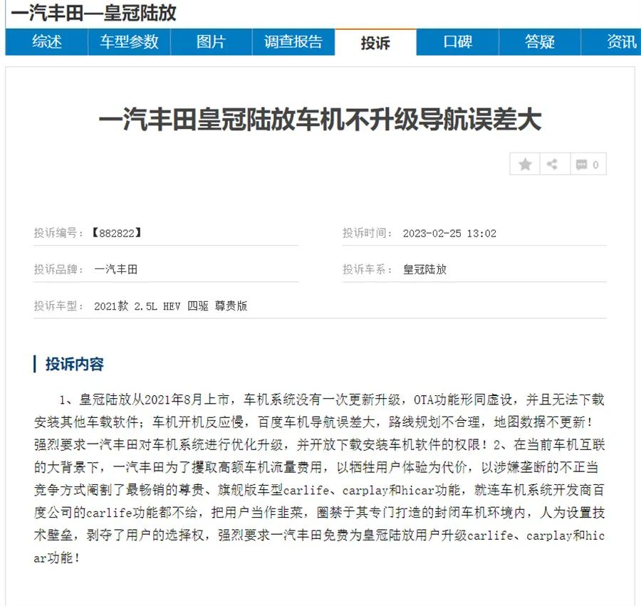 其中皇冠陆放以及汉兰达所反映的问题比较相似,包括车机系统迟迟未升级更新,车机系统地图功能老旧导航不准,车机系统卡顿以及车机系统的语音助手与音乐等功能无法正常使用等故障,至于名爵HS也与其相似,同样面临车机系统迟迟未升级、车机卡顿的问题,只不过区别在于多为老款车型。