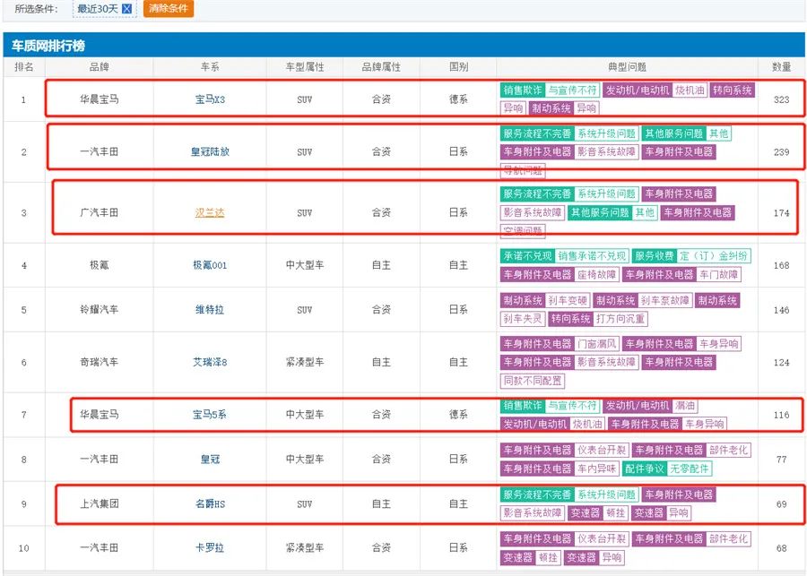 《道哥说车》编辑注意到,在第三方汽车投诉平台车质网投诉排行榜(近30天)位列前十的车型中,有5款车型均涉及车机类投诉,其中包括宝马X3、皇冠陆放、汉兰达、宝马5系、名爵HS。