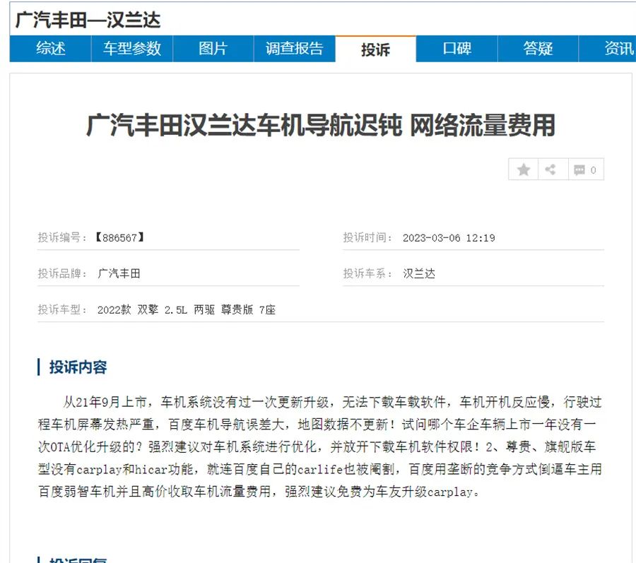 目前来看,车机系统涉嫌减配以及涉嫌与宣传不符类的投诉并不多见,而相比之下,皇冠陆放、汉兰达以及艾瑞泽8、名爵HS车型所反映出的车机卡顿或部分功能缺失、不好用以及迟迟未升级的问题就比较常见了。