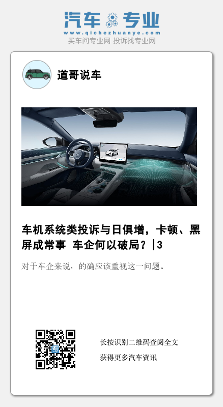 【文/道哥说车 听风吟】如果放在5—10年前,用户对于汽车产品的投诉一般集中在发动机烧机油、变速箱顿挫、车身生锈等问题上,但随着传统汽车工艺以及三大件技术的进步,这些投诉已经鲜少集中爆发。反而在智能化的潮流下,关于车机系统的投诉却与日俱增。