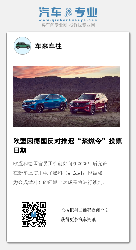据外媒报道,欧盟推迟了对“禁止销售内燃机新车”立法生效的关键投票,此前德国在最后一刻出人意料地表示反对,并指出担心欧盟的环保计划会对工业造成不利的影响。