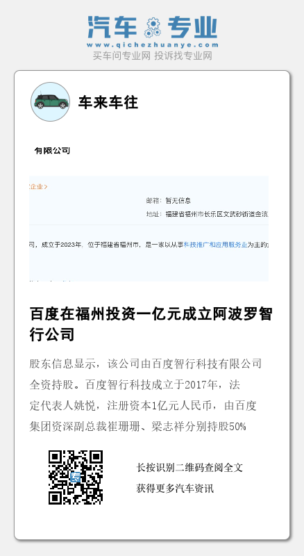 天眼查信息显示,2月24日,阿波罗智行科技(福州)有限公司成立,法定代表人为吴书林,注册资本1亿元人民币。该公司经营范围包括智能车载设备销售、新能源汽车整车销售、网络预约出租车经营服务等。