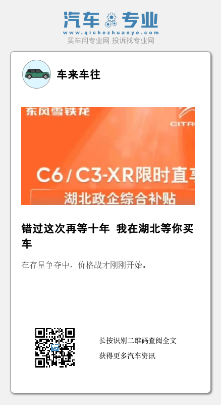 其中反响最大、热度最高的莫过于,售价21.19万元的东风雪铁龙C6,一款车长近5米轴距2.9米的标准B级车,在政企综合补贴9万元之后,售价低至12.19万元。这个价格,连轩逸、朗逸、卡罗拉之流的A级车都要点头哈腰。
