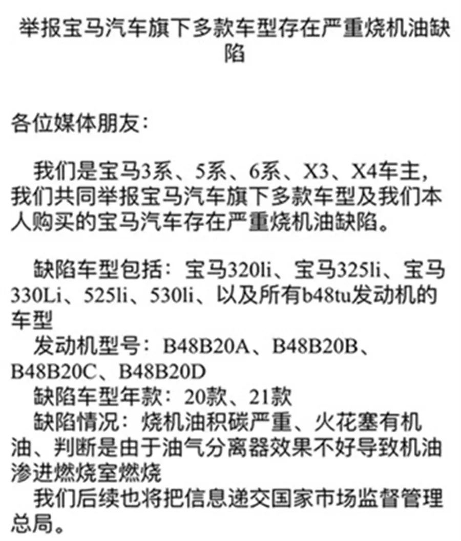 (来源:百名车主联合举报宝马汽车旗下多款车型存在严重烧机油缺陷的声明)