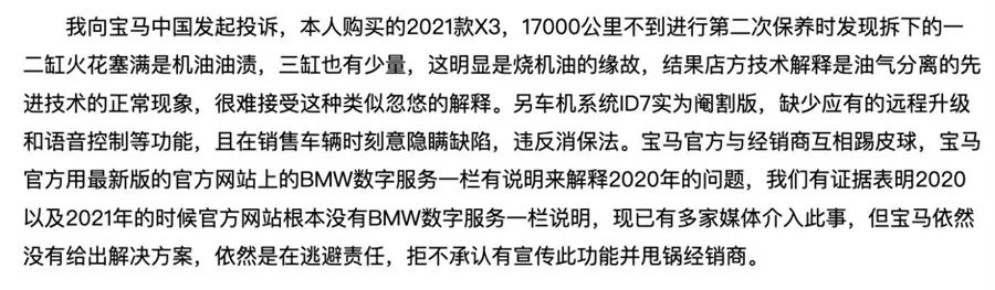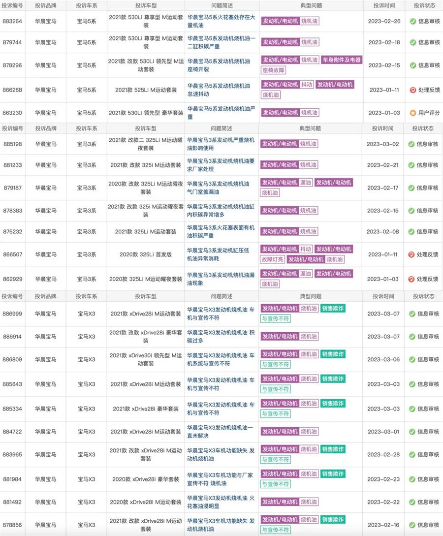 针对车主们的联名投诉,虽然宝马官方也曾做出回应,但问题没得到解决,导致投诉量越积越多。从今年年初,关于宝马发动机烧机油的问题仍是接二连三地出现,其中以宝马X3发动机烧机油问题的投诉最多。