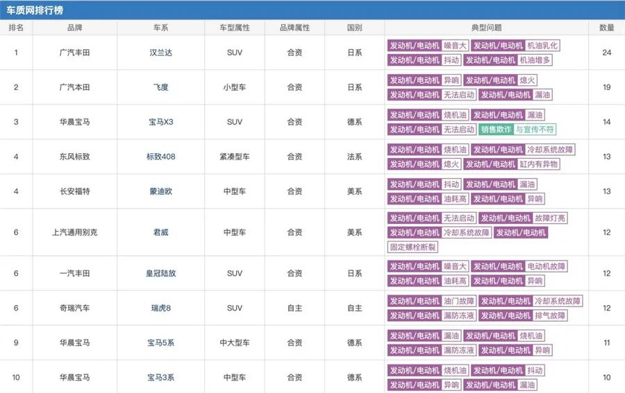 那么都涉及哪些车型呢?根据第三方汽车投诉平台车质网投诉排行榜(近30天),位列发动机/电动机类投诉前十的车型包括汉兰达、飞度、宝马X3、标致408、蒙迪欧、君威、皇冠陆放、瑞虎8、宝马5系、宝马3系。