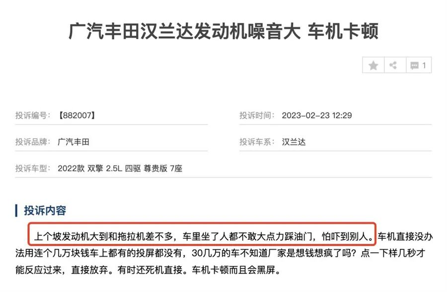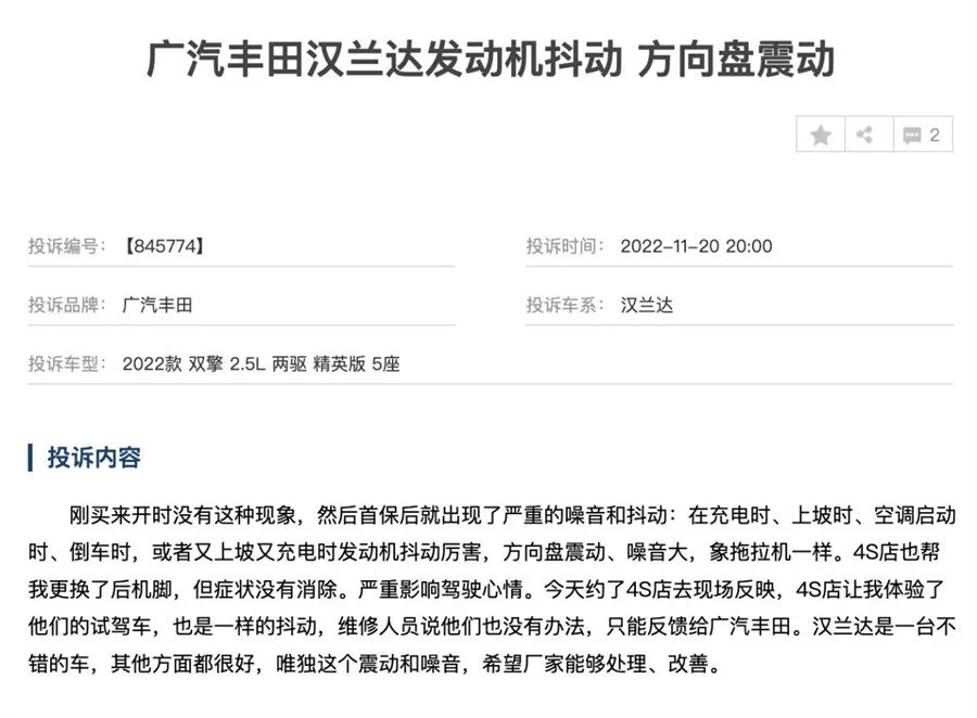 以车质网上,发动机问题最集中的2022款双擎2.5L四驱版汉兰达的投诉为例:据车主描述,发动机噪音大得离谱,深踩油门时就像在开拖拉机。不仅发动机噪音很大,甚至整个车都会振动。