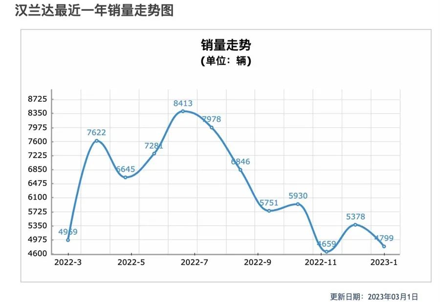 不仅是口碑,“神车”的销量也走下神坛。鼎盛时期的汉兰达,其月销量可以轻松破万,但从去年开始,汉兰达的销量就开始持续下滑,2022年下半年的平均月销量只有五千多台,可以说是“腰斩式”下滑。据最新数据,2023年2月,汉兰达月销量为4799辆,也足以看出负面新闻缠身对销量的影响。