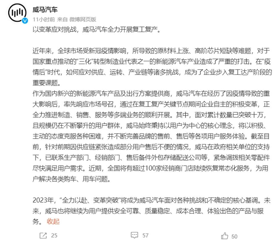 【文/道哥说车 听风吟】在相继曝出停工、裁员减薪、APP服务宕机等负面消息之后,威马汽车终于迎来了难得的好消息。3月7日,威马汽车发布微博表示,正全力开展复工复产,近期将有超100家经销商门店陆续恢复常态化服务。
