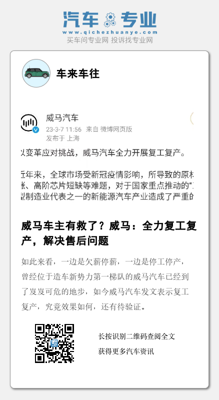 3月7日,威马汽车在社交平台上发文称,威马汽车全力开展复工复产。