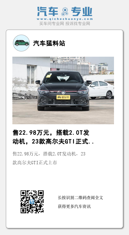 日前,2023款高尔夫(图片|配置|询价)GTI正式上市,售价为22.98万元,新车相较普通版风格略有调整,并搭载了第三代EA888 2.0T发动机,具体如何,我们不妨一起关注一下。