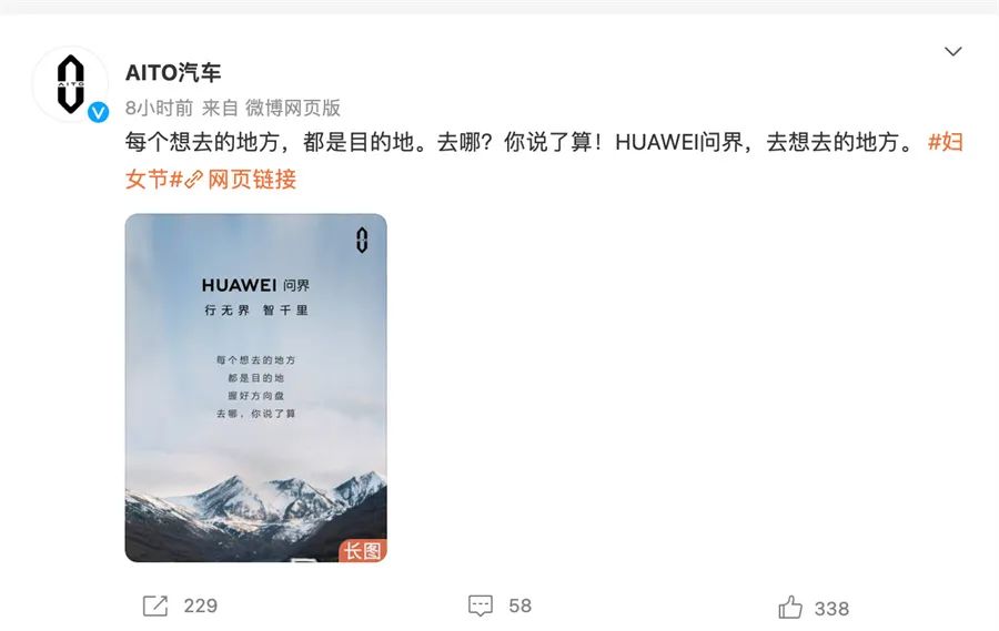 3月8日,AITO品牌多个官方宣发渠道在宣传品牌车型有关内容时,用上了“HUAWEI问界”的措辞,取代了此前的AITO问界,并且华为终端的官方微博也用上了这一措辞。