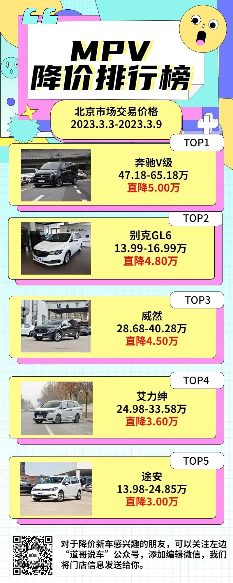 MPV方面,奔驰V级的降幅再度回落到5万元,与上周直降3.3万元相比,威然本周的降幅达到了4.5万元。