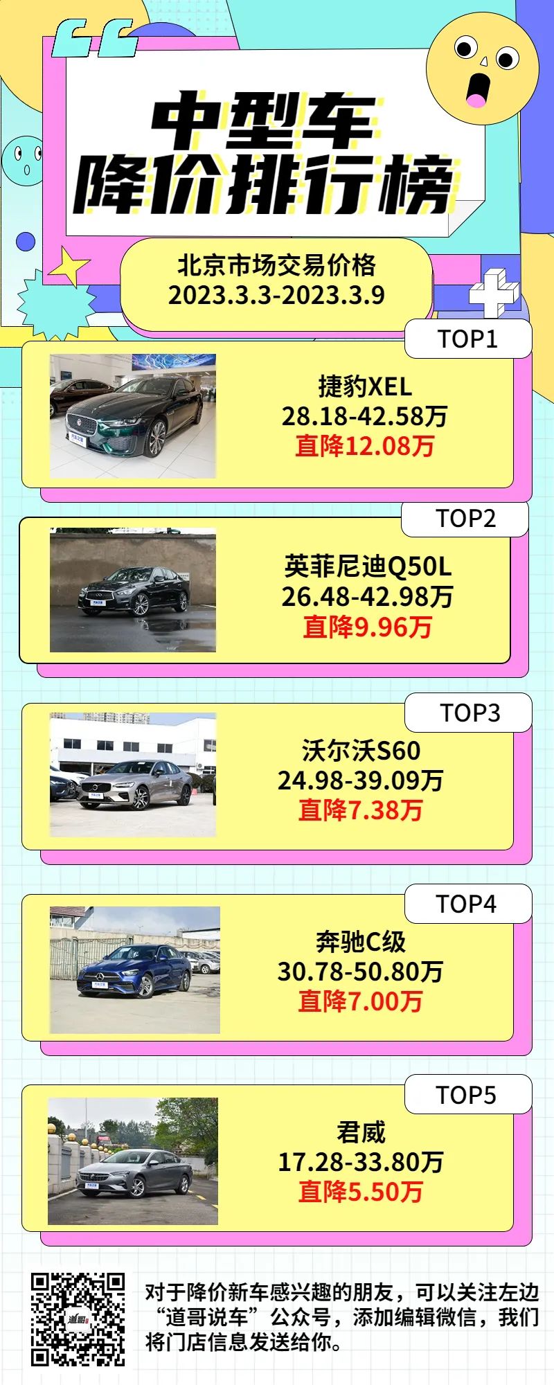 小型车方面,降价幅度高的还是那几款车型,只是排名次序有轻微变动;中型车方面,上周的奔驰C级(进口)落榜,君威入榜,且各车型的降价幅度没有上周高了。
